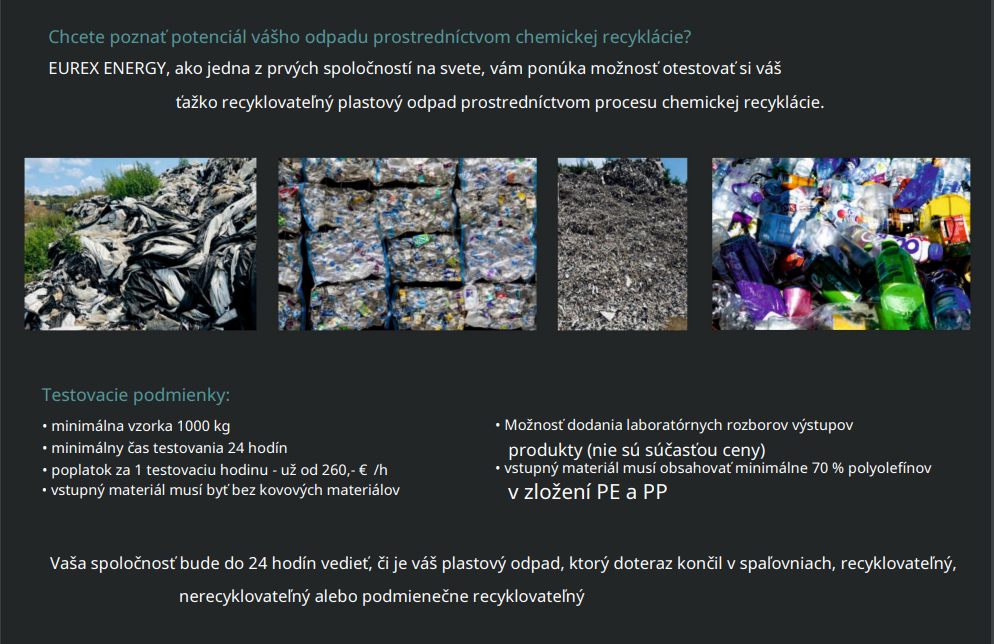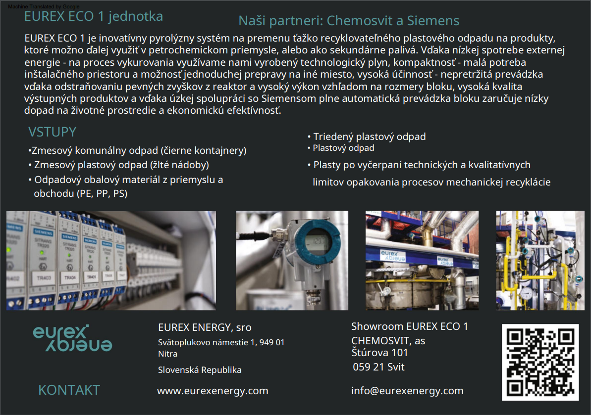 Eurex Energy, s.r.o. zúročil na vlastnom vývoji s využitím zahraničných poznatkov a skúseností vo výrobe novej technológie s využitím obnoviteľných a alternatívnych zdrojov energie zariadenie EUREX ECO 01 na zhodnocovanie zmesových odpadových plastov vo forme chemickej recyklácia.ed.